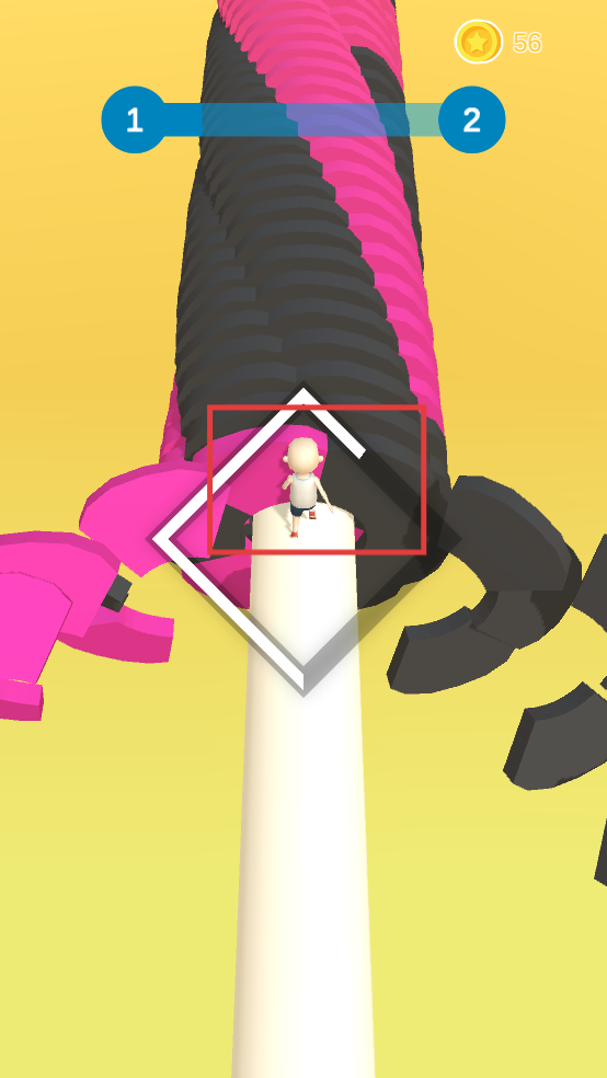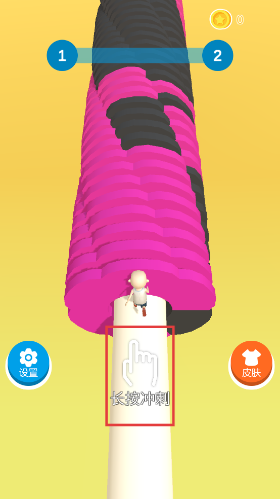1、进入作品后,根据提示长按屏幕让角色在柱状路径上冲刺前进,朝着目标方向移动。