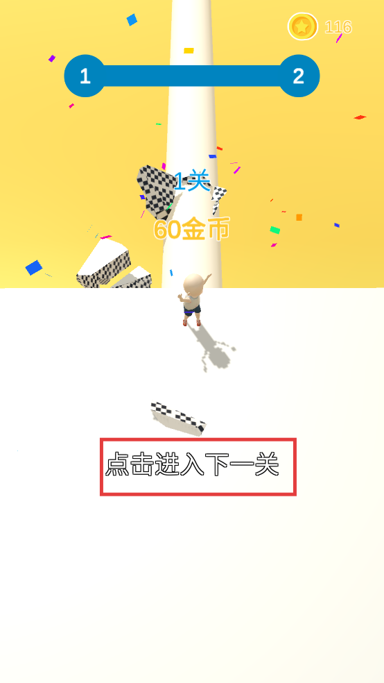 4、第一关成功通关,获得60金币,界面显示“点击进入下一关”,点击该提示区域,即可进入下一关。