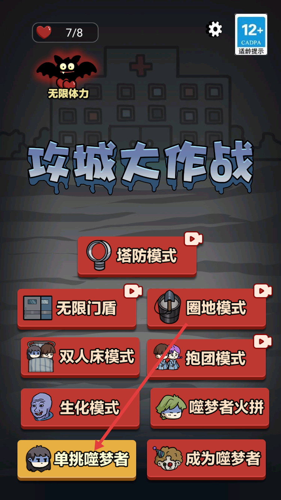 1、进入《攻城大作战》,选【单挑噬梦者】模式,借助【无限体力】开启挑战。