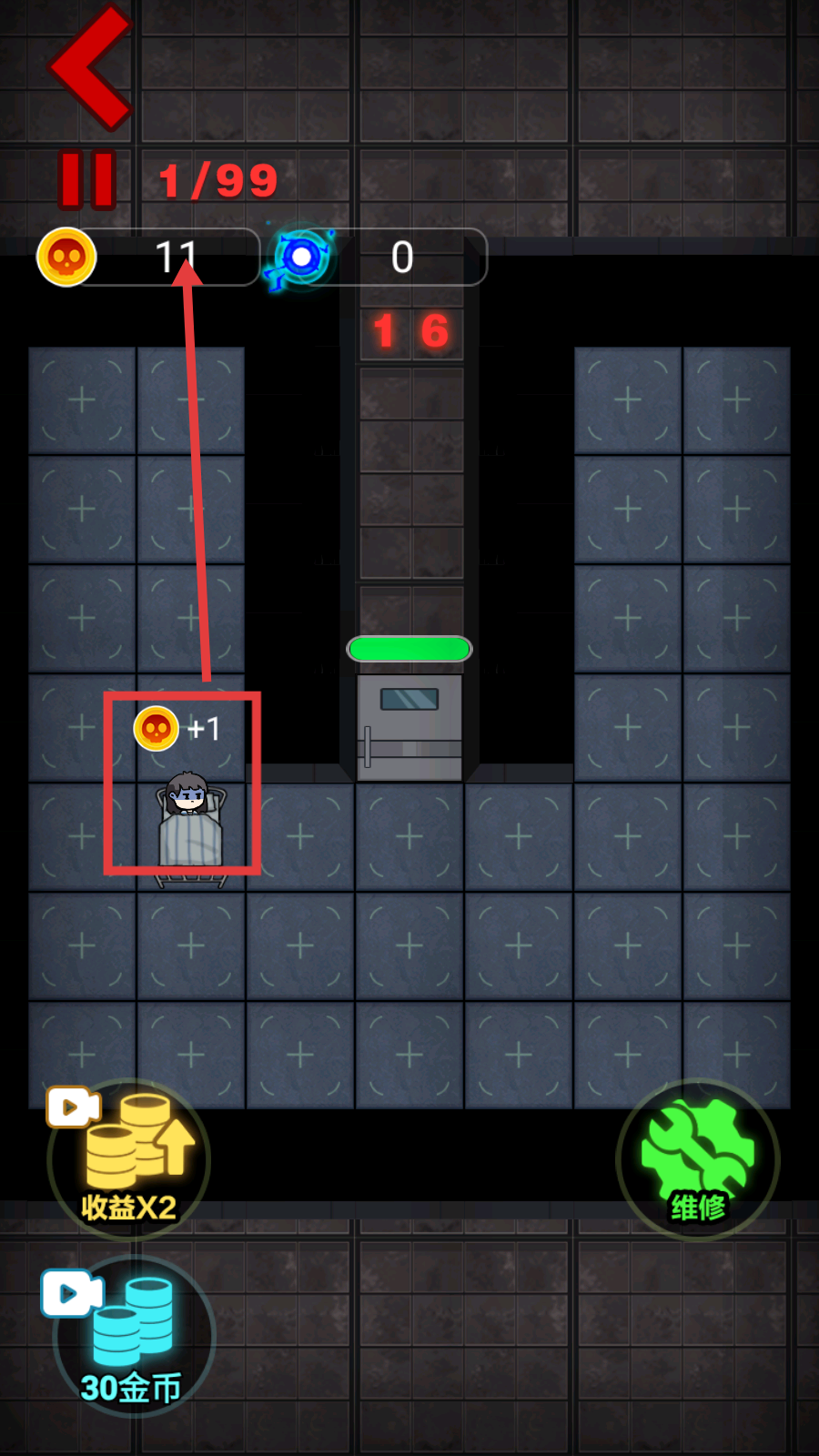 1、初始房间选择:开局找到合适房间最好与舍友面对面,关门躺床开始发育,升级门和炮台抵挡第一波攻势。