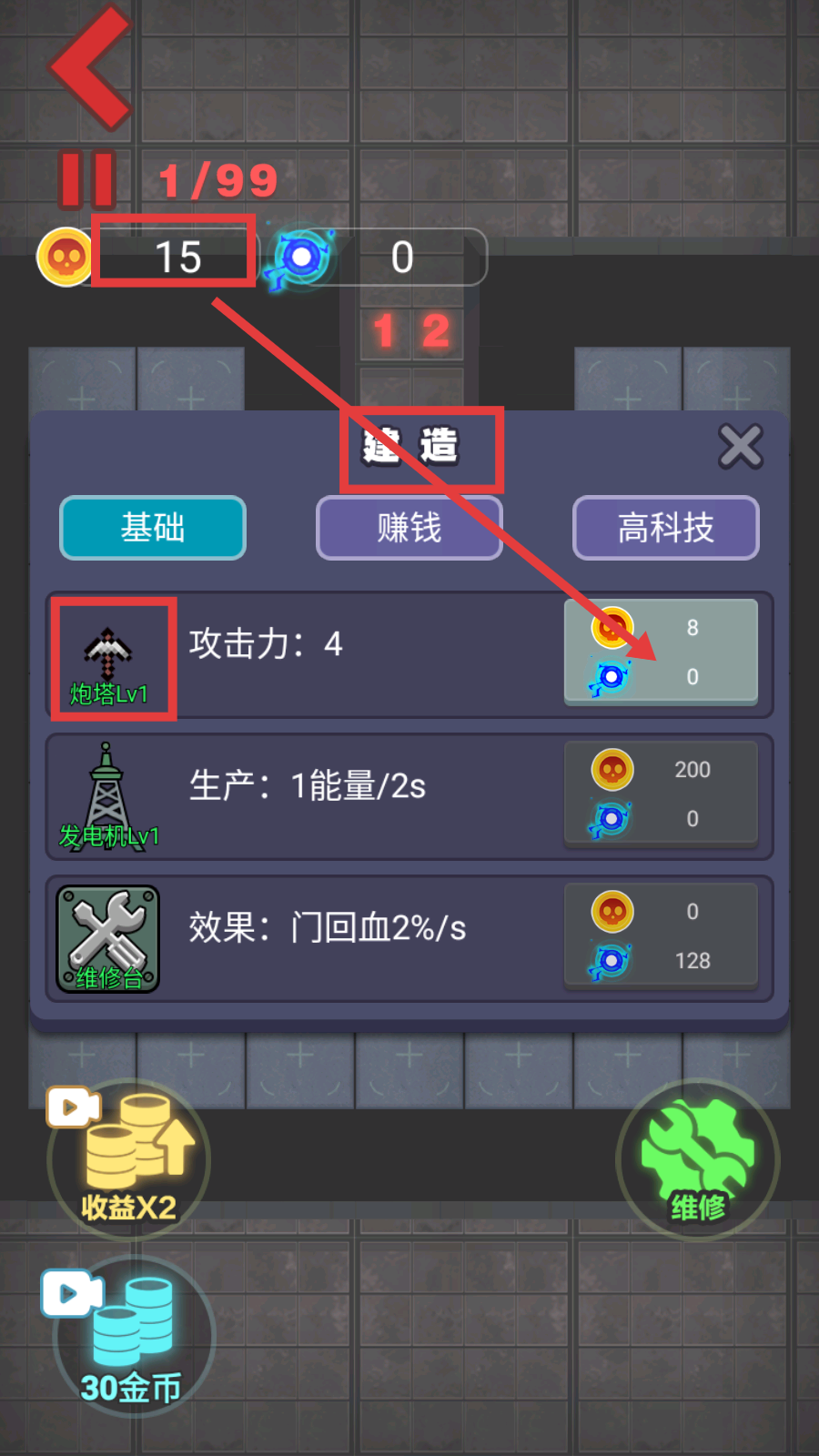 3、打开【建造】界面,花8金币造【炮塔Lv1】,提升攻击力,强化攻防能力。
