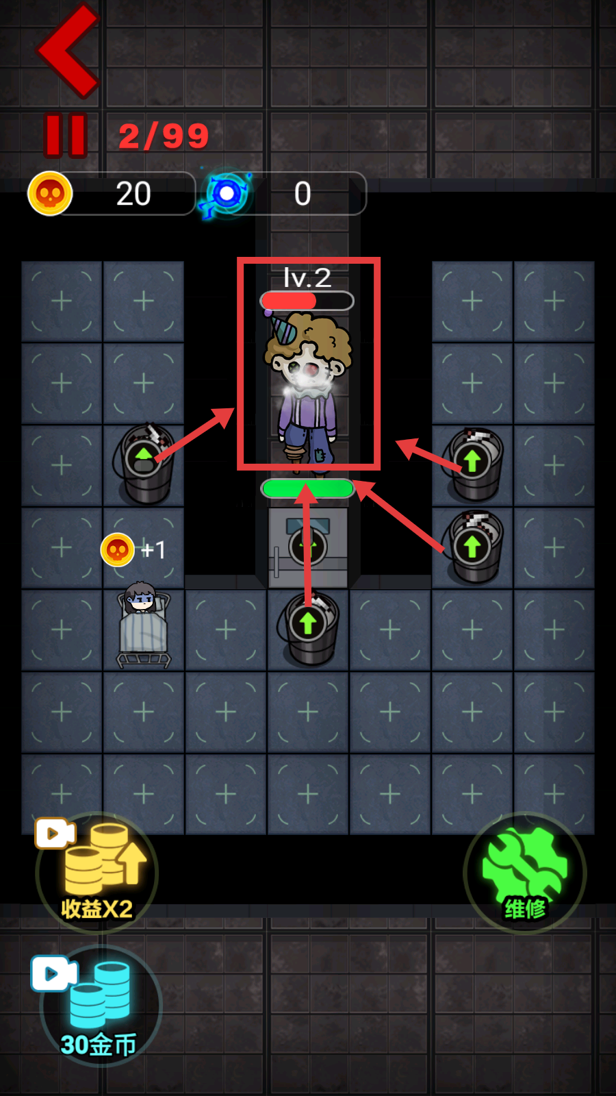 2、设施升级顺序:有金币优先升级门和炮台,随后升级床铺决定游戏成败,建造游戏机产生能量支持后期发展。