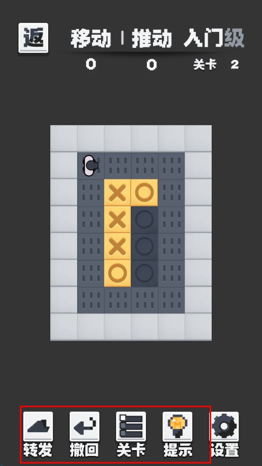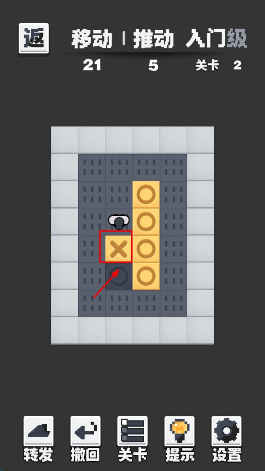 2、在关卡内,操控角色移动,推动黄色箱子到目标位置(带圈的格子)。