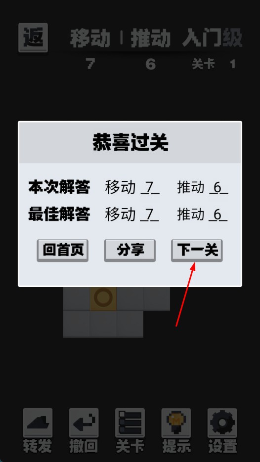 4、成功通关后,点击【下一关】,继续挑战更复杂的推箱子关卡。