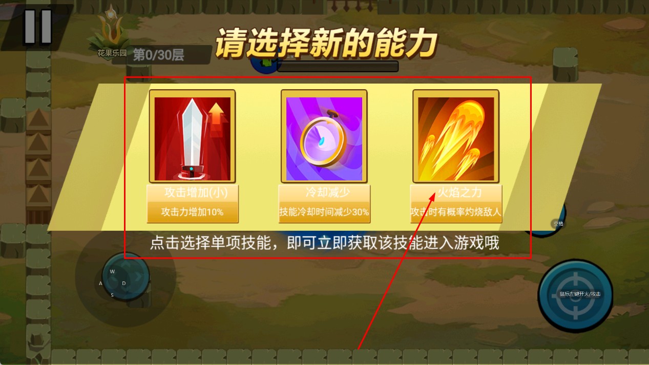 1、进入游戏,在能力选择界面,挑选一项新能力,如“火焰之力”,获取后进入游戏。