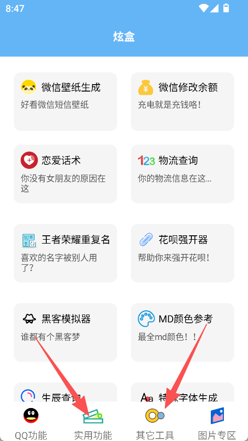 《酷盒工具箱》包含丰富多样的工具,涉及生活、社交、娱乐等诸多场景。可生成微信壁纸、辅助微信相关视觉设置;能查询物流信息;有恋爱话术助力交流;支持王者荣耀重复名设置,解决游戏取名困扰;具备翻译功能,满足文字转换需求;还有黑客模拟器等趣味应用,为不同方面的需求提供便利。