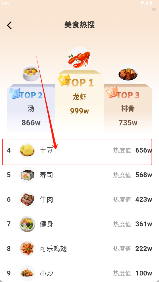 1、在首页“美食热搜”榜单中浏览热门菜品,根据指示点击“土豆”条目进入搜索页。