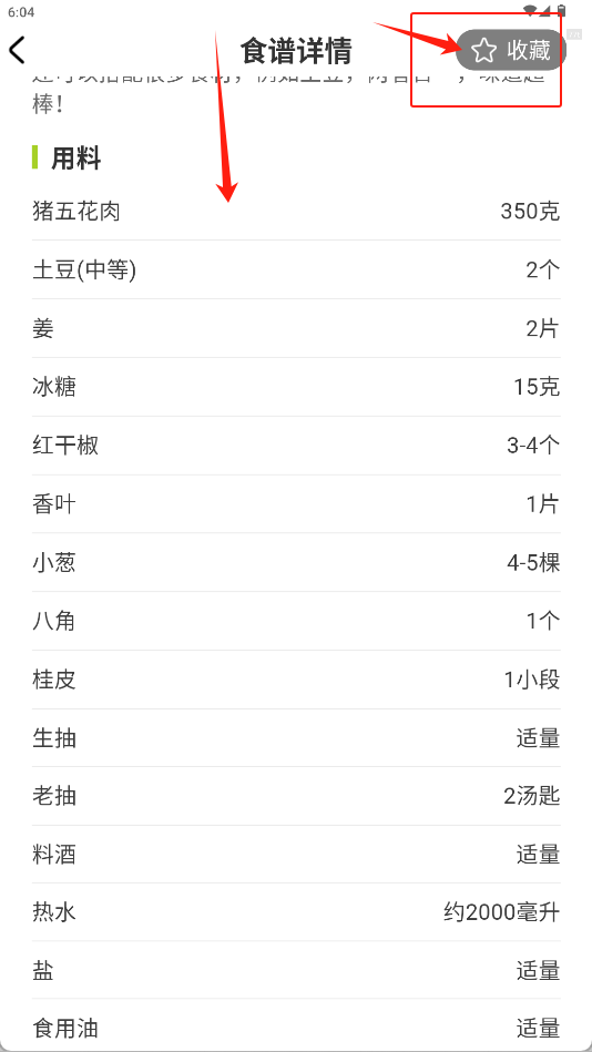 3、在菜谱详情页上下滑查看用料清单,点击右上角“收藏”即可保存该菜谱。
