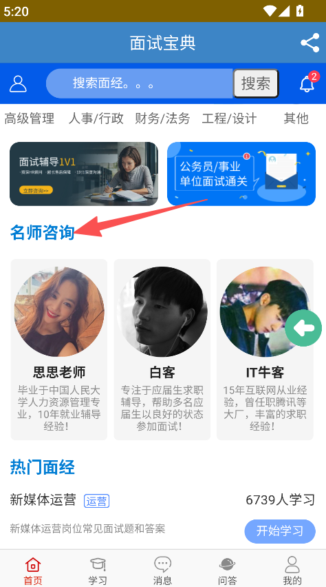 1、进入名师咨询,选择老师获取求职辅导。