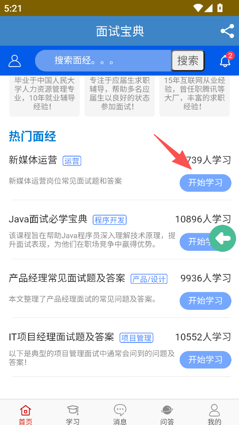 2、找到热门面经,点击开始学习,掌握岗位面试题及答案。