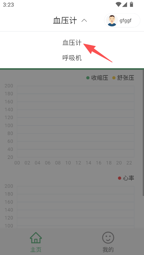 1、支持设备选择,可在血压计、呼吸机中选择目标设备,进入对应健康管理界面。