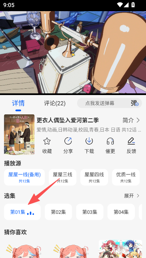 2、拥有动漫详情功能,可收藏、分享、下载动漫,还能选择播放源和选集,满足观看前的操作需求。