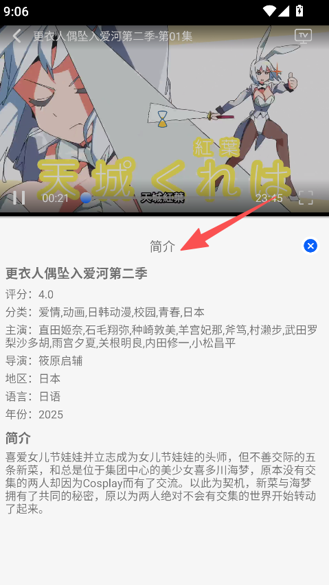 3、播放时点击简介,查看动漫信息。
