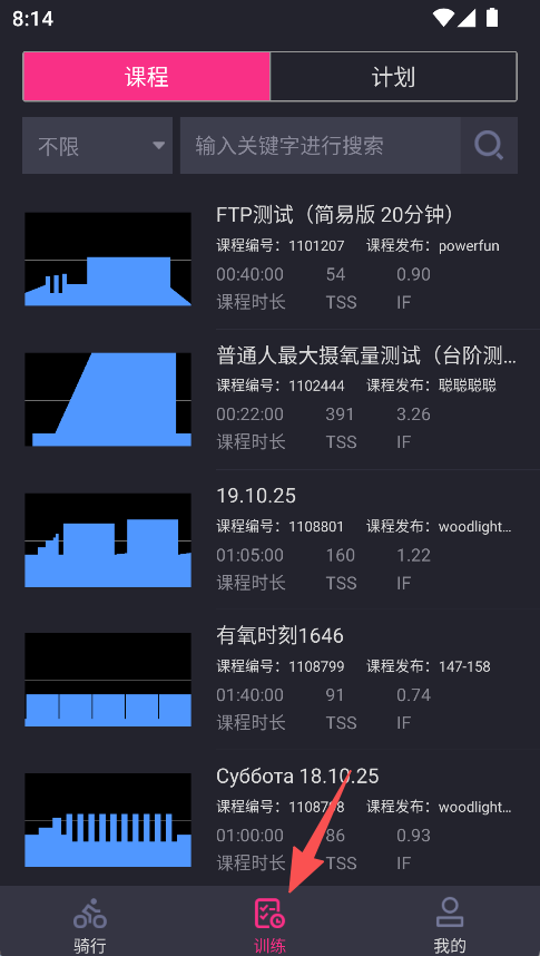 1、训练课程丰富,包含FTP测试、最大摄氧量测试等多种类型,训练选择多样且信息明确。