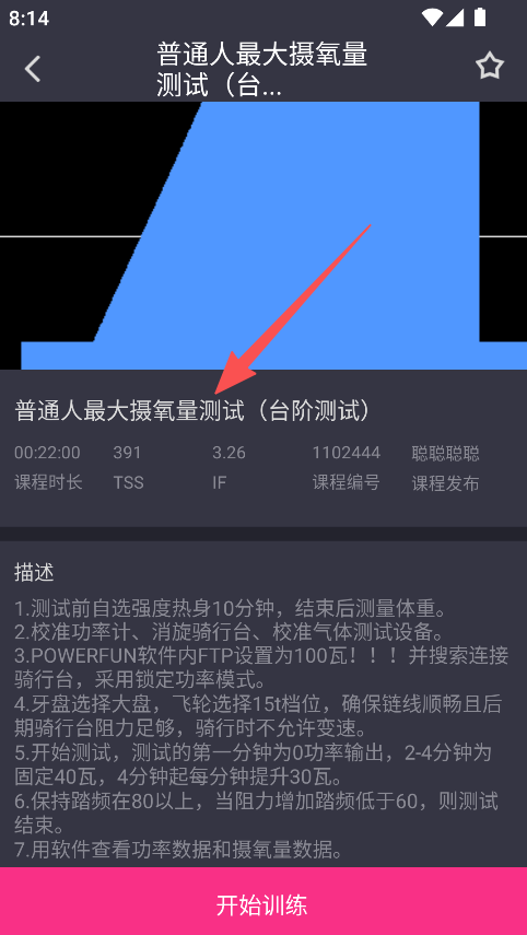 3、拥有课程描述功能,详细说明训练步骤,如热身、设备校准、功率设置等,指导用户规范训练。