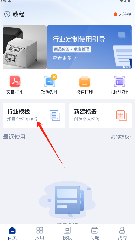 1、在应用首页点击指向的“行业模板”模块,进入模板选择页。