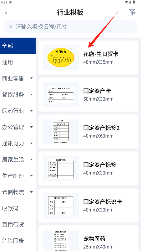 2、在行业模板页面的分类中找到并点击“花店-生日贺卡”模板进行选择。