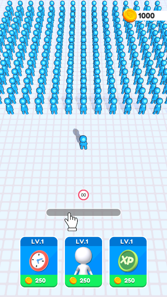 1、游戏中,点击按住屏幕移动小人,在人群中翻滚,把其他小人粘合一起变成一个人肉球。