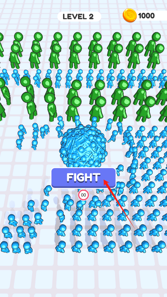 2、粘合的小人越多自己的人肉球就越大,15秒过后,点击FIGHT开始下一场的对决。