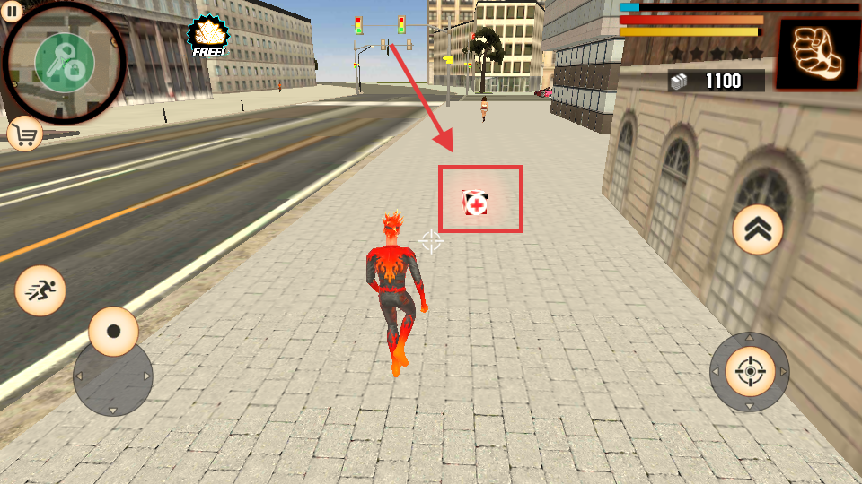 1、控制角色移动至带红十字的箱子旁,拾取该道具,可恢复生命或补充资源,提升续航能力。