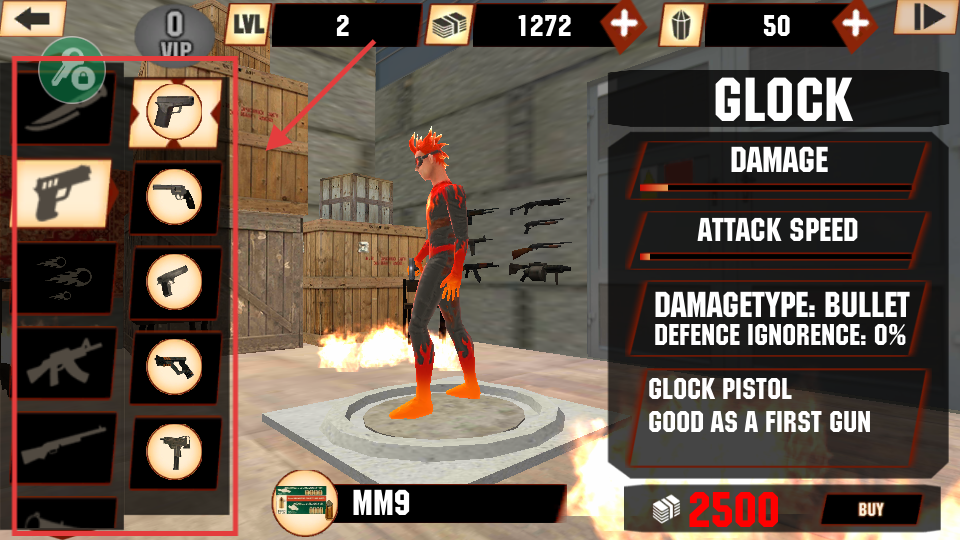 4、在武器界面选择枪械(如【GLOCK】),查看属性后花费【2500】购买,提升角色战斗能力。