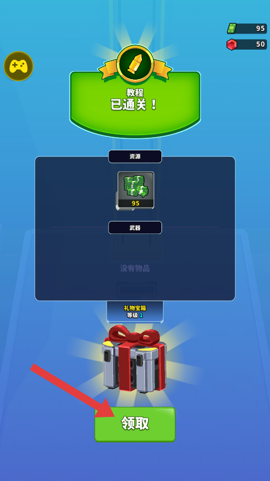 4、关卡通关后点击【领取】按钮,获取资源和宝箱奖励,用于提升角色和武器实力。
