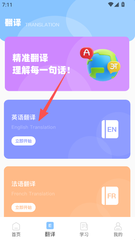 1、进入翻译板块,选择英语或法语翻译,输入内容点击翻译。