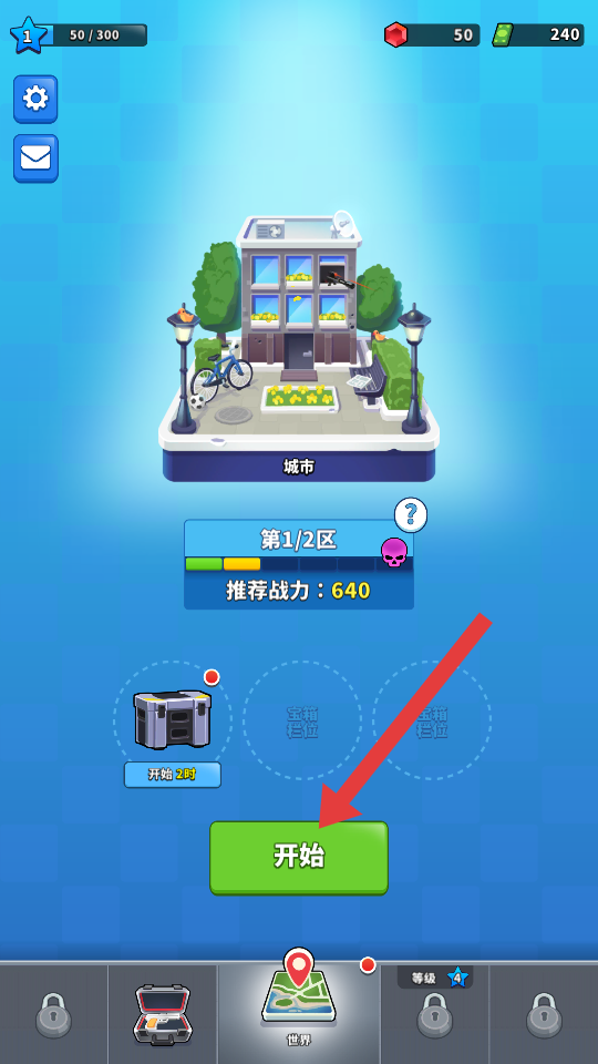 1、在世界界面点击【开始】,进入对应区域关卡,挑战前关注推荐战力,确保战力达标后再推进。