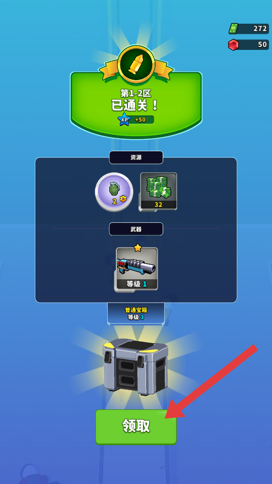 4、关卡通关后点击【领取】按钮,获取资源、武器和宝箱奖励,用于强化角色和解锁新装备。
