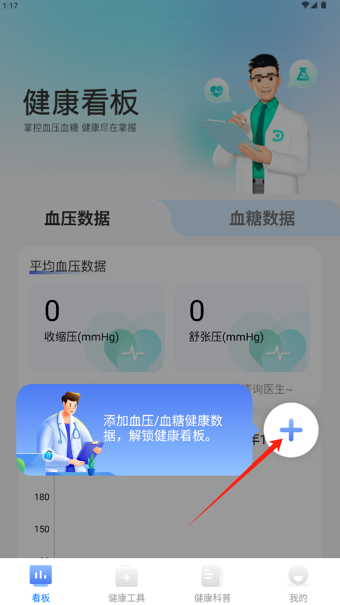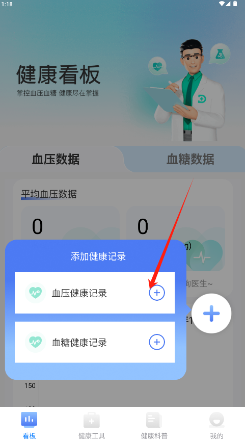 1、在应用首页“健康看板”页点击底部“+”按钮。