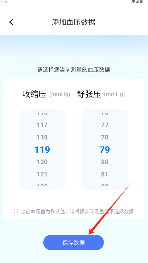 3、在血压数据页面选择或输入具体的收缩压与舒张压数值后,点击底部“保存数据”完成记录。