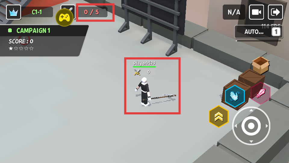 2、操控红框内的角色,在关卡中移动,注意上方的任务进度【0/5】,逐步完成杀敌任务。