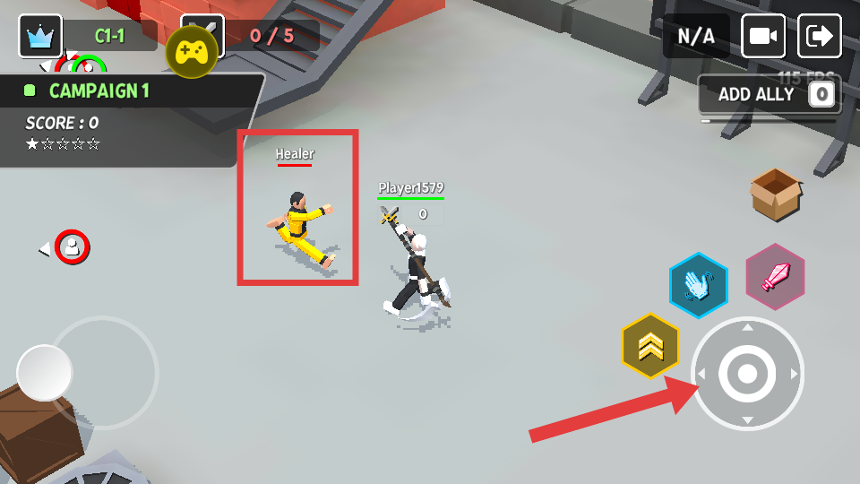 3、利用右侧虚拟摇杆瞄准敌人,如红框内的【Healer】,发起攻击,同时可搭配盟友协同作战。