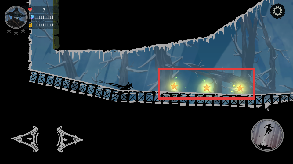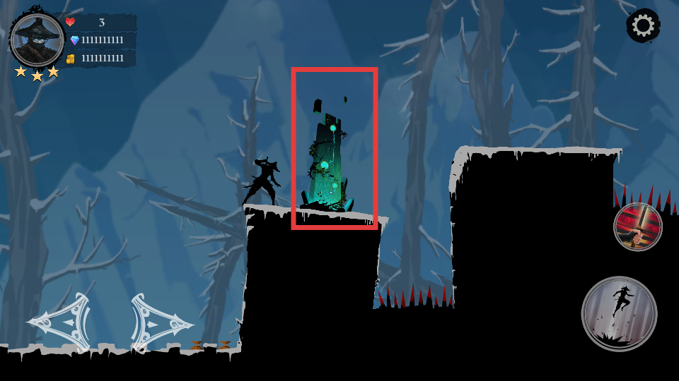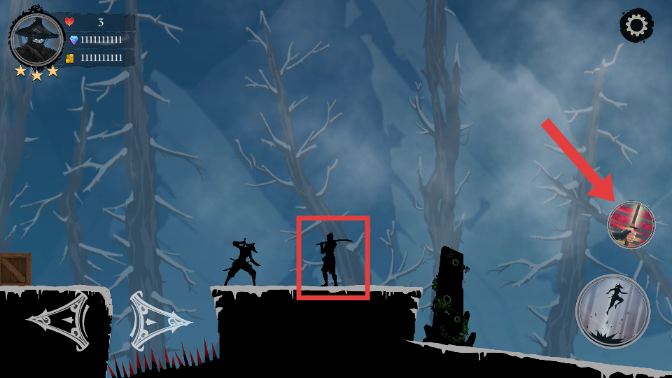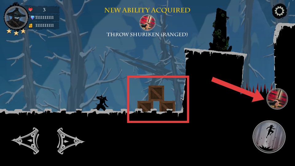 2、获得【THROW-SHURIKEN-(RANGED)】技能后,点击右侧技能按钮,投掷飞镖破坏红框内的木箱等障碍物。