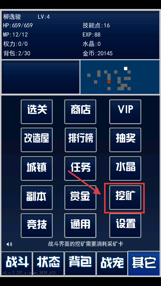 1、点击【挖矿】按钮进入矿区界面,挖矿需消耗采矿卡,可获取游戏资源。