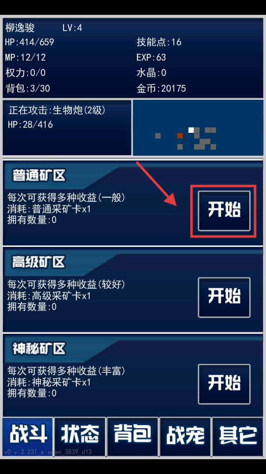 2、选择矿区(如普通矿区),点击【开始】,消耗对应采矿卡,获取多种收益。