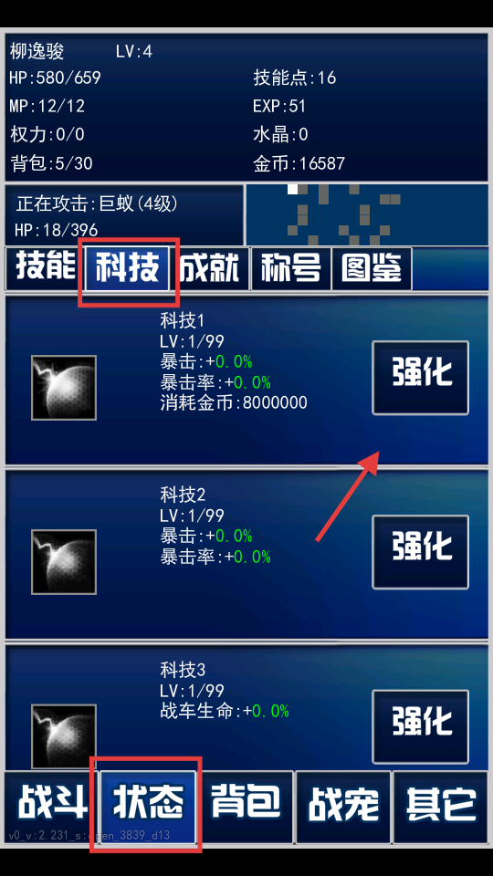 4、进入【状态】-【科技】界面,点击【强化】提升科技等级,增强战车属性。