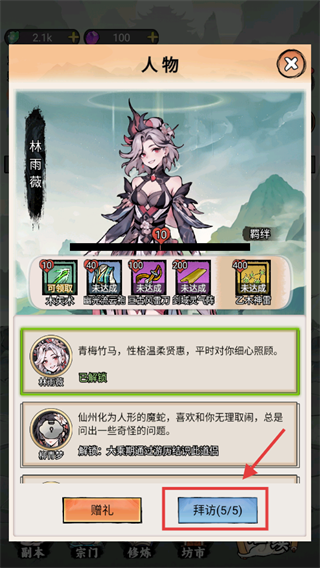 1、在人物界面点击【拜访(5/5)】,与角色互动,触发好感提升等后续事件。