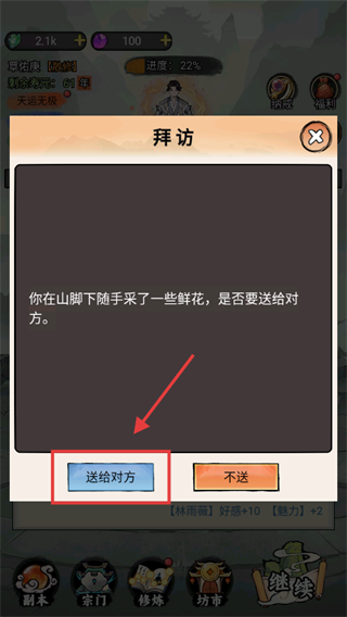2、拜访时选【送给对方】,提升【林雨薇】好感+10、【魅力】+2,增强羁绊。