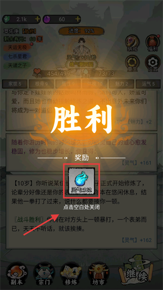 4、战斗胜利后,点击空白处关闭【灵气x162】奖励界面,继续游戏流程。