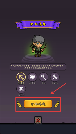 1、在职业选择界面选好职业(如【弓箭手】)后,点击【开始游戏】按钮,即可进入地牢开启冒险。
