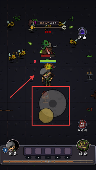 2、战斗时操控角色移动(下方控制区域),躲避【蜜蜂】类怪物攻击,同时输出伤害,灵活走位保生存。