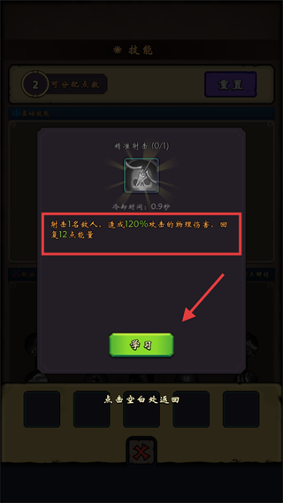 3、技能界面中,【精准射击】可对1名敌人造成【120%】攻击的物理伤害并回复【12】点能量,点击【学习】提升战力。