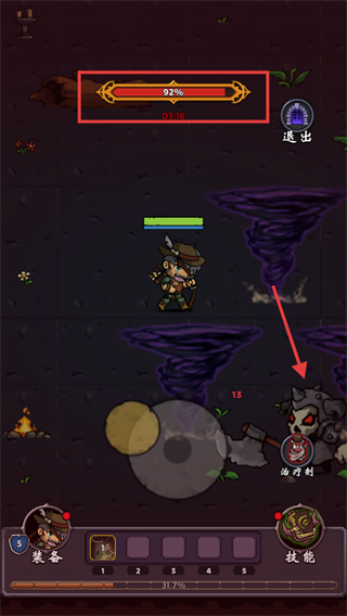 4、BOSS战时关注上方进度条(【92%】),走位躲技能,血量危急时点击【治疗剂】回血,保障续航输出。