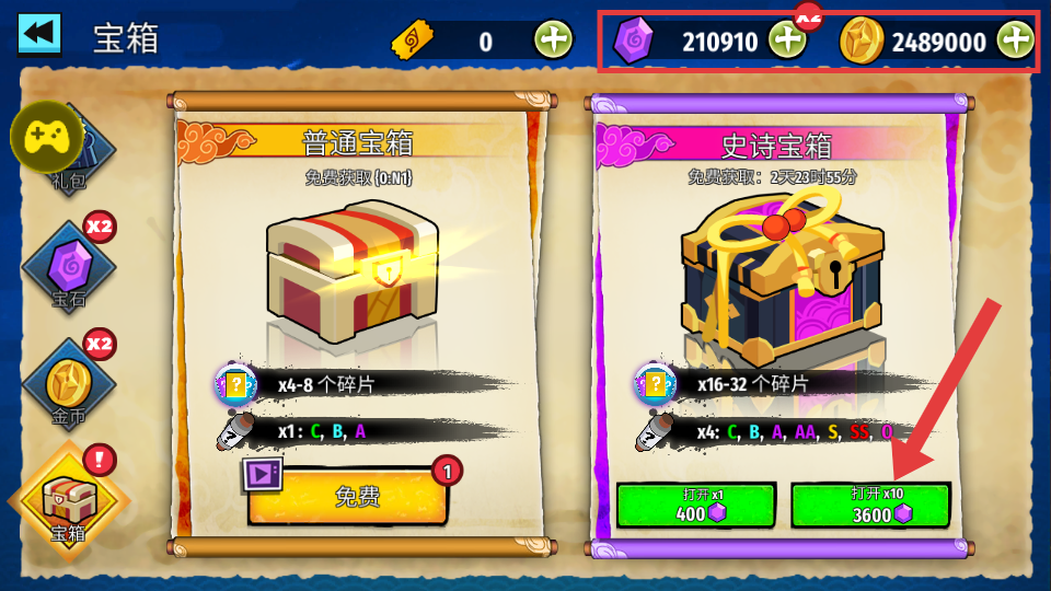 1、点击【宝箱】按钮,进入宝箱界面,可查看普通宝箱和史诗宝箱的奖励内容。