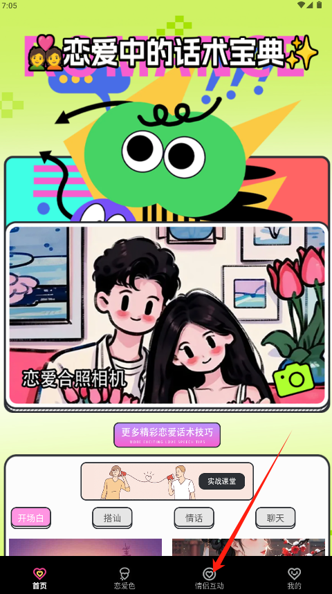 1、应用定位聚焦恋爱社交场景,核心内容围绕恋爱话术技巧与情侣互动功能进行系统性组织。