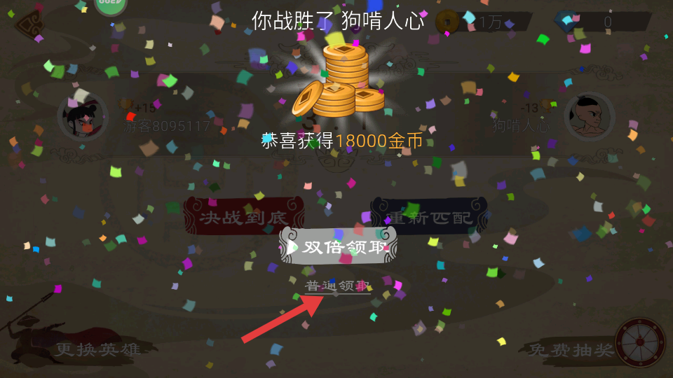 4、战胜对手后,点击【普通领取】按钮,获得金币奖励,积累游戏资源。