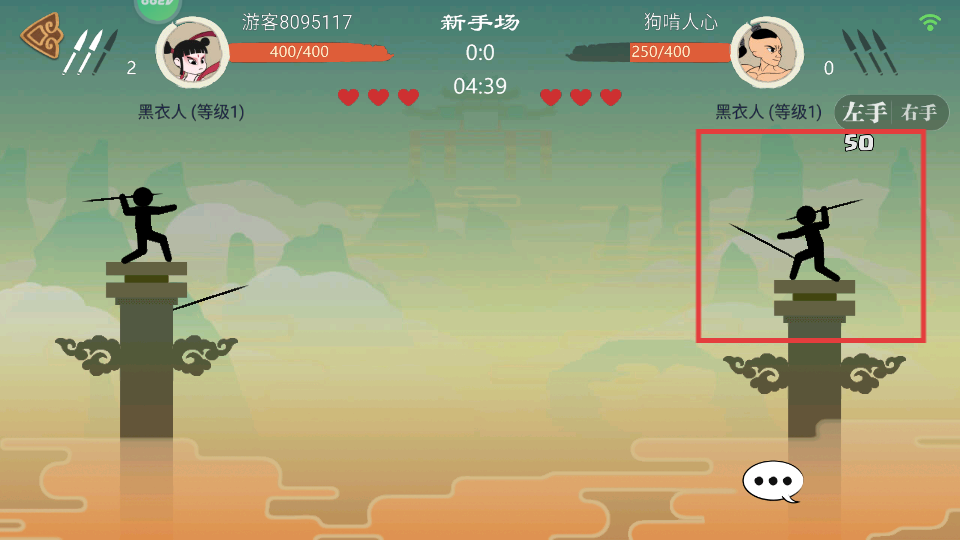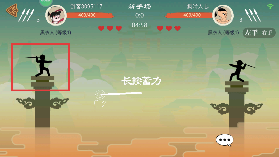 2、在对战中长按蓄力,控制黑衣人投掷武器,向对手发起攻击。