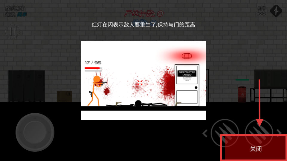 2、当出现敌人重生提示时,点击右下角的【关闭】按钮继续战斗,战斗中要保持与门的距离,避免被重生的敌人近距离突袭。