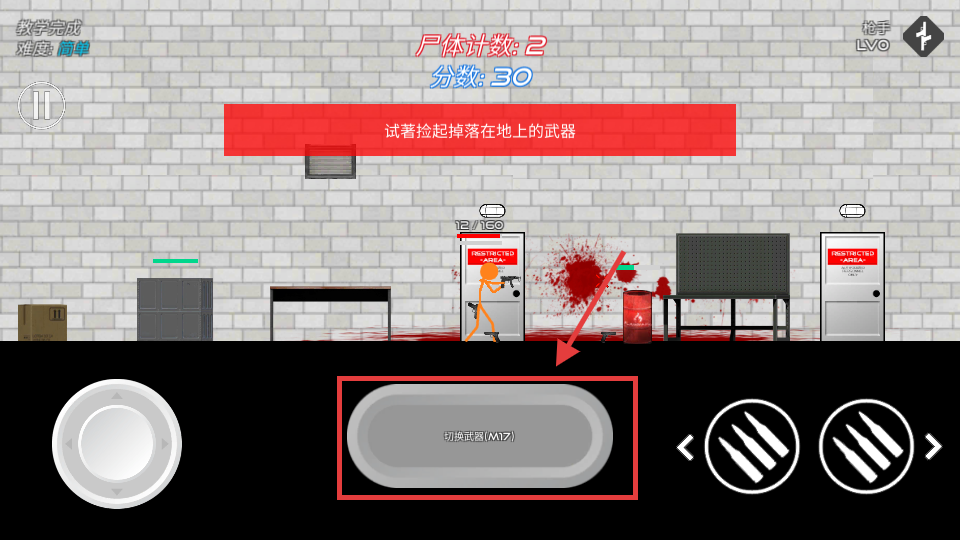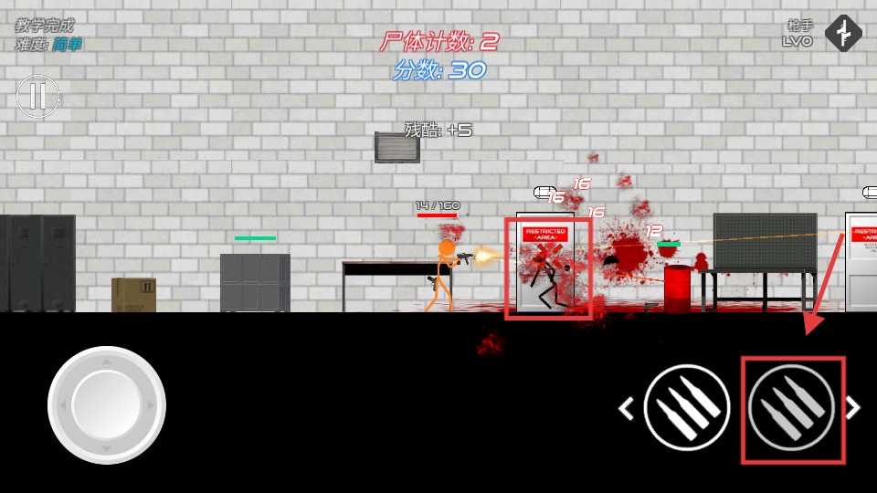 3、点击右下角的攻击按钮(子弹图标)射击敌人,快速击杀敌人可提升分数与尸体计数,战斗时需留意敌人位置,确保射击精准。